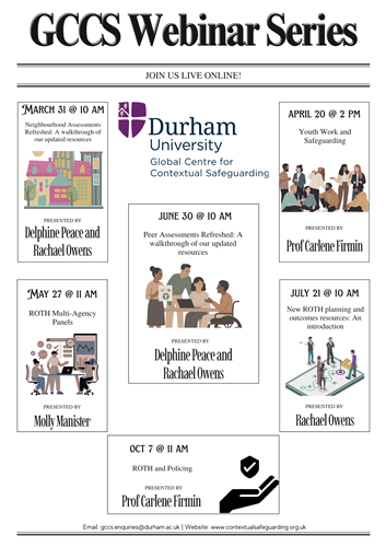 This new series from the Global Centre for Contextual Safeguarding brings our incredible team members LIVE and direct to you to speak on a range of Contextual Safeguarding topics, keeping you both informed and up to date with the latest news and research in the field. Starting on Tuesday, 31st March, the series will run up to Wednesday October 7th; all further details, including links to register, can be found below.