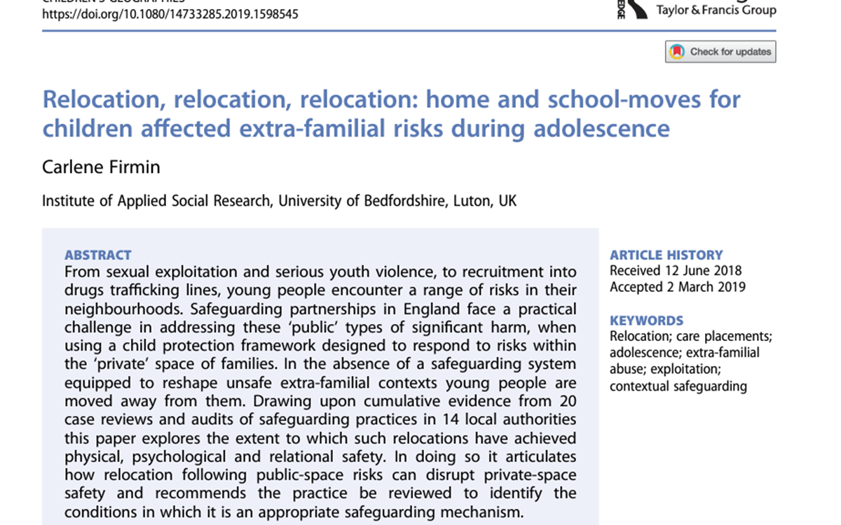 Firmin (2019). Drawing upon cumulative evidence from 20 case reviews and audits of safeguarding practices in 14 local authorities this paper explores the extent to which such relocations have achieved physical, psychological and relational safety.