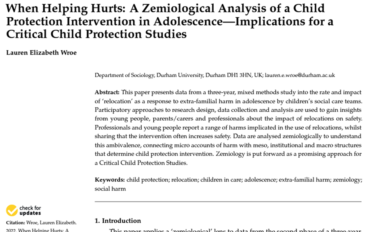 Wroe (2022). This paper presents data from a three-year, mixed methods study into the rate and impact of ‘relocation’ as a response to extra-familial harm in adolescence by children’s social care teams.