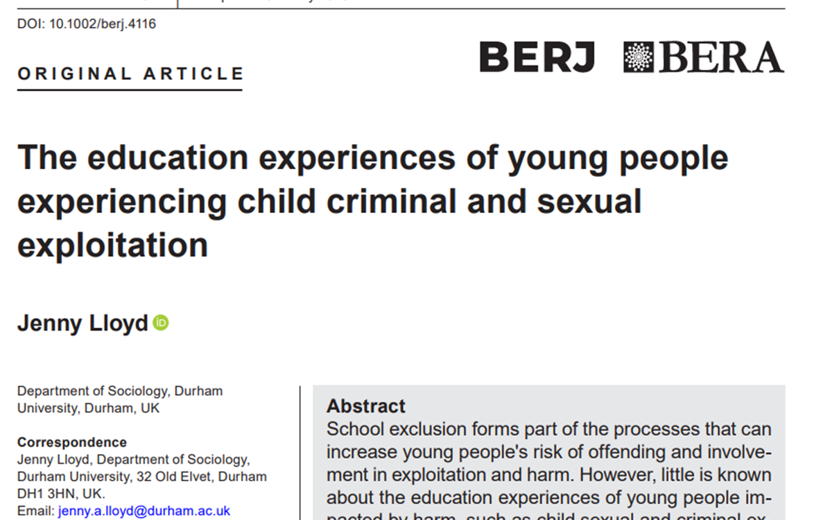 Lloyd (2025). This paper presents findings from a survey with 17 children's and families' social care departments in England and Wales to understand the education experiences of children open to social care for extra-familial harm.