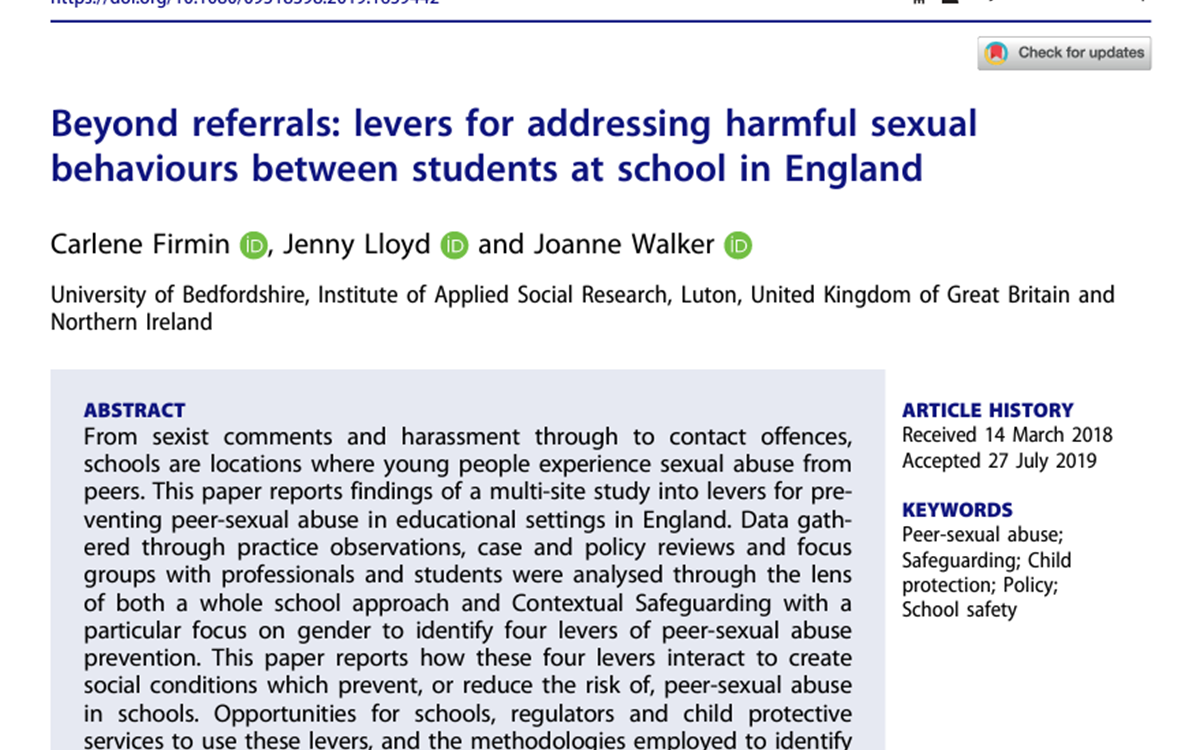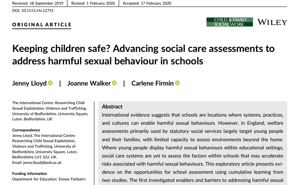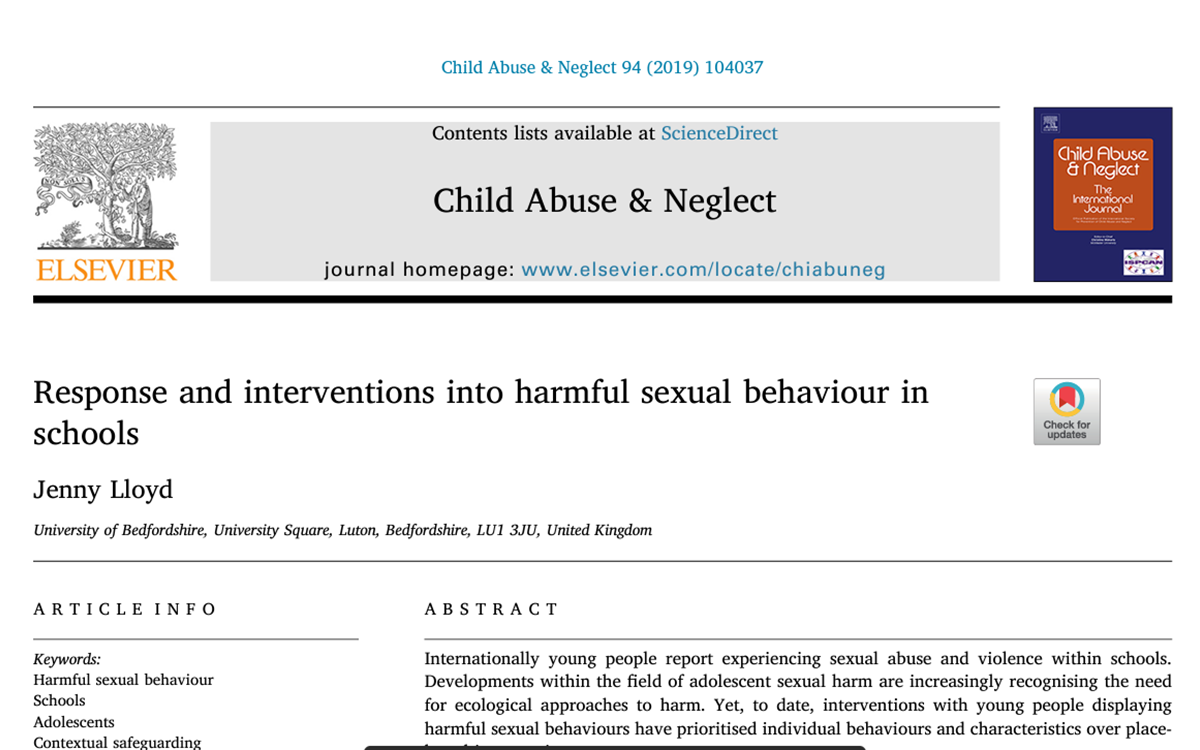 Lloyd (2019). This article presents empirical evidence from a mixed-methods study aimed at understanding the enablers and barriers to preventing and responding to harmful sexual behaviour in schools.