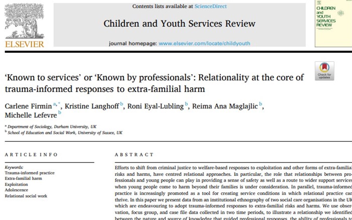 Firmin et. al (2024) In this paper we present data from an institutional ethnography of two social care organisations in the UK which are endeavouring to adopt trauma-informed responses to extra-familial risks and harms. the article explores the way that many young people subject to intervention are ‘known-to-services’ and call for more responses in which young people are ‘known-by-professionals’ who are supporting them.