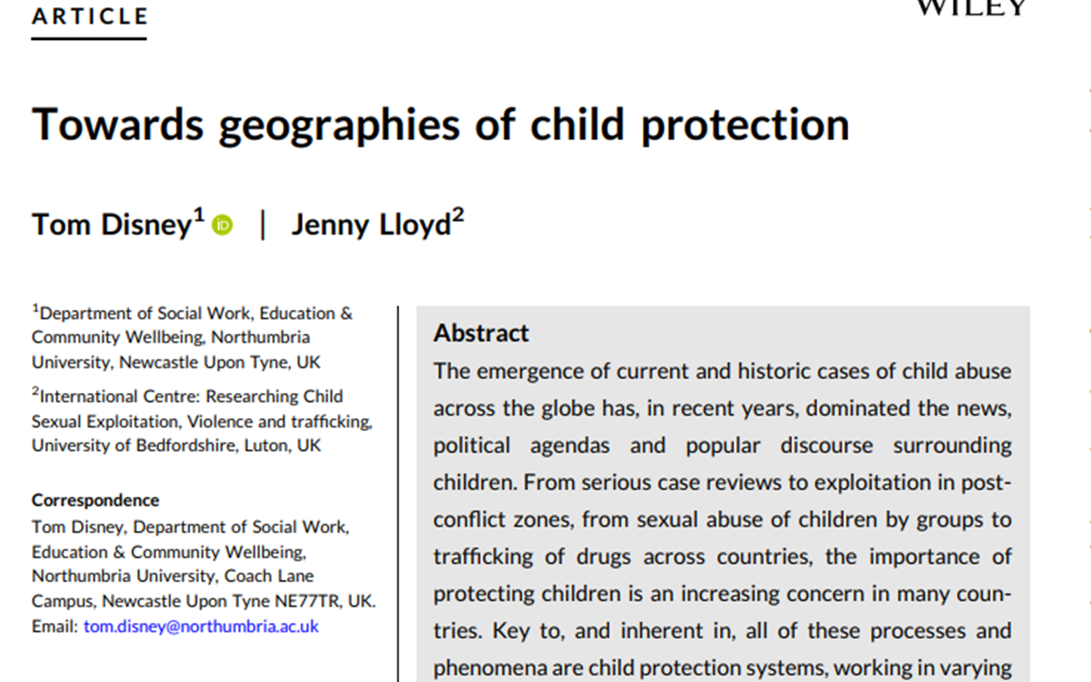 Disney & Lloyd (2020). In this article, we seek to develop an introduction to geographies of child protection, producing an initial critical review which points to future research avenues in this field.