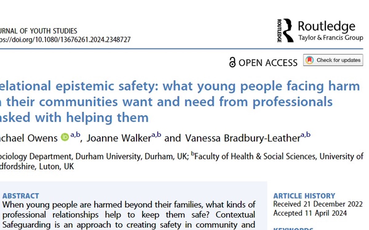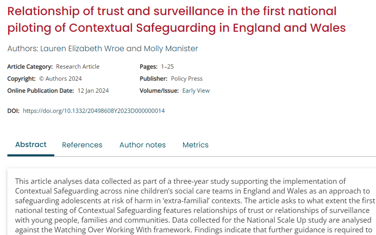 Wroe & Manister (2024). The article asks to what extent the first national testing of Contextual Safeguarding features relationships of trust or relationships of surveillance with young people, families and communities.