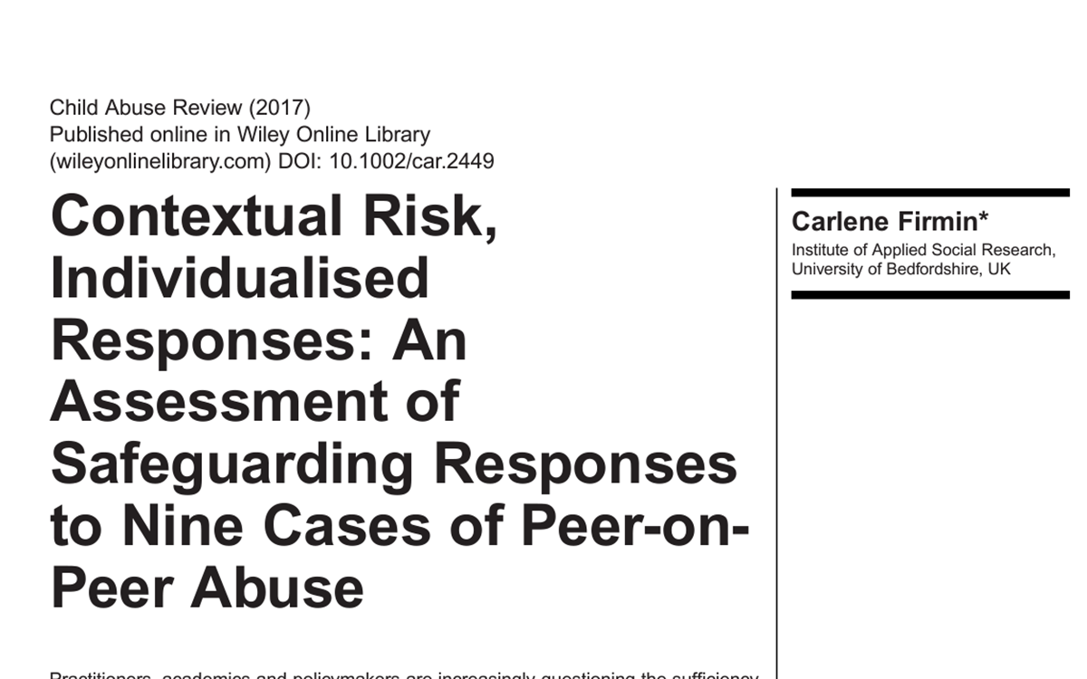 Firmin (2017). Abuse Between Young People: A Contextual Account is the first book to offer a contextualised narrative of peer-on-peer abuse that moves beyond recognising an association between environments and individual choice, and illustrates the ways in which such interplay occurs.