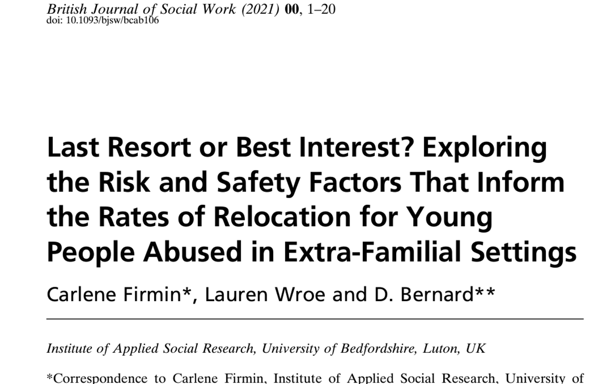 Firmin, Wroe & Bernard (2022). Using survey and interview data, this article examines how relocations are used in response to extra-familial harm (EFH) in thirteen children’s services departments in England and Wales.