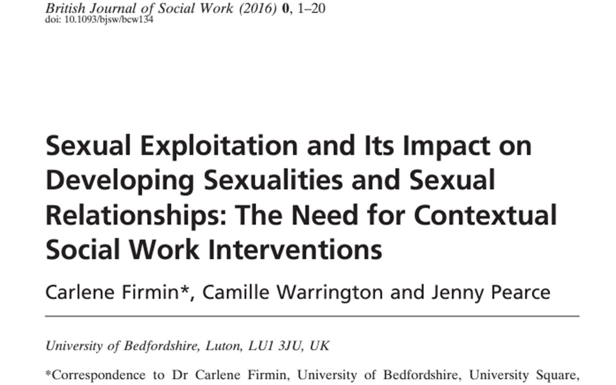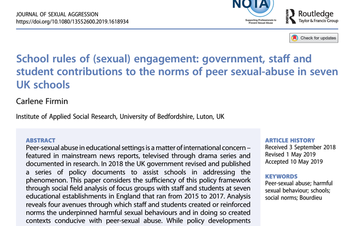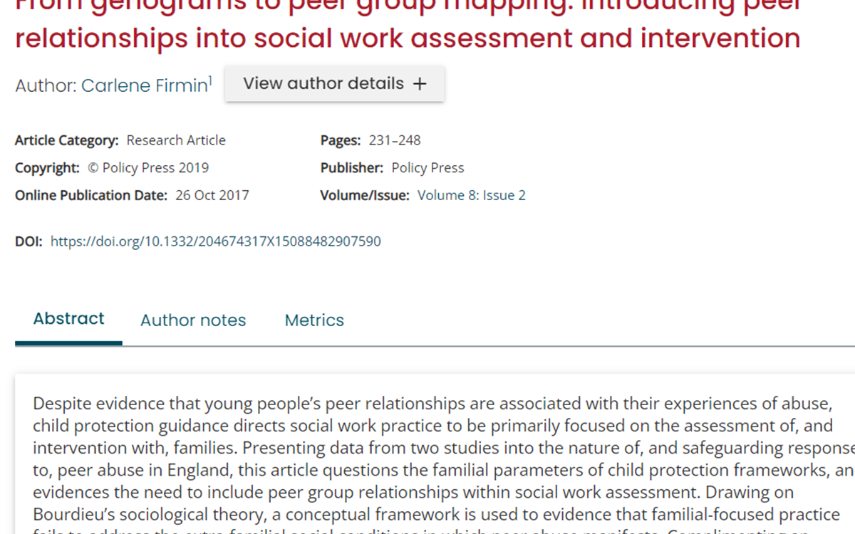 Firmin (2019). Presenting data from two studies into the nature of, and safeguarding response to, peer abuse in England, this article questions the familial parameters of child protection frameworks, and evidences the need to include peer group relationships within social work assessment.