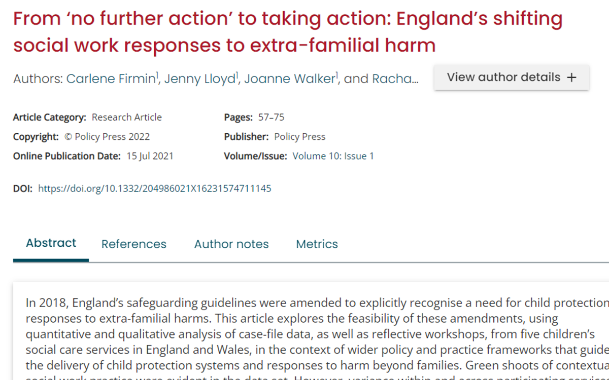 Firmin, C., Leferve, M., Langhoff, K. and Ruch, G. (2024). This article reports findings from a three year ethnography of six social care sites that used innovative responses to extra-familial risks and harms.