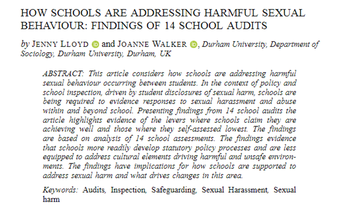 Lloyd & Walker (2023). This article considers how schools are addressing harmful sexual behaviour occurring between students. In the context of policy and school inspection, driven by student disclosures of sexual harm, schools are being required to evidence responses to sexual harassment and abuse within and beyond school. Presenting findings from 14 school audits the article highlights evidence of the levers where schools claim they are achieving well and those where they self-assessed lowest.