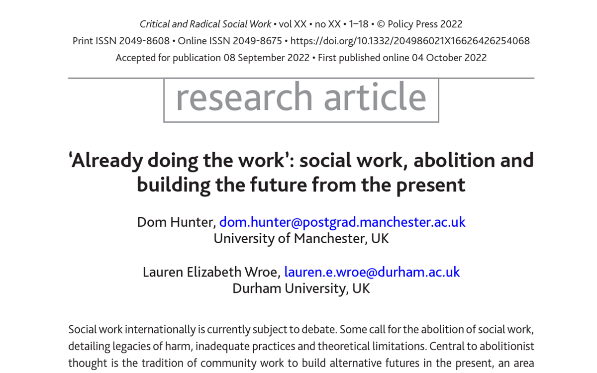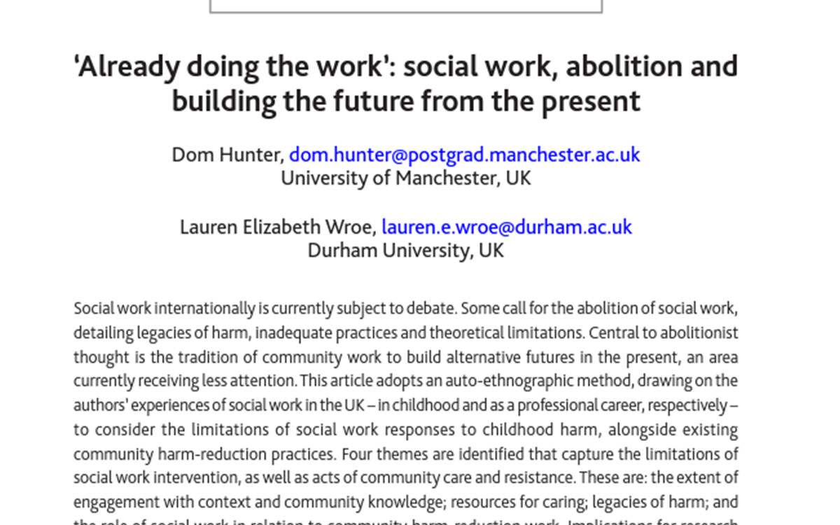 Hunter & Wroe (2022). This article adopts an auto-ethnographic method, drawing on the authors’ experiences of social work in the UK – in childhood and as a professional career, respectively – to consider the limitations of social work responses to childhood harm, alongside existing community harm-reduction practices.