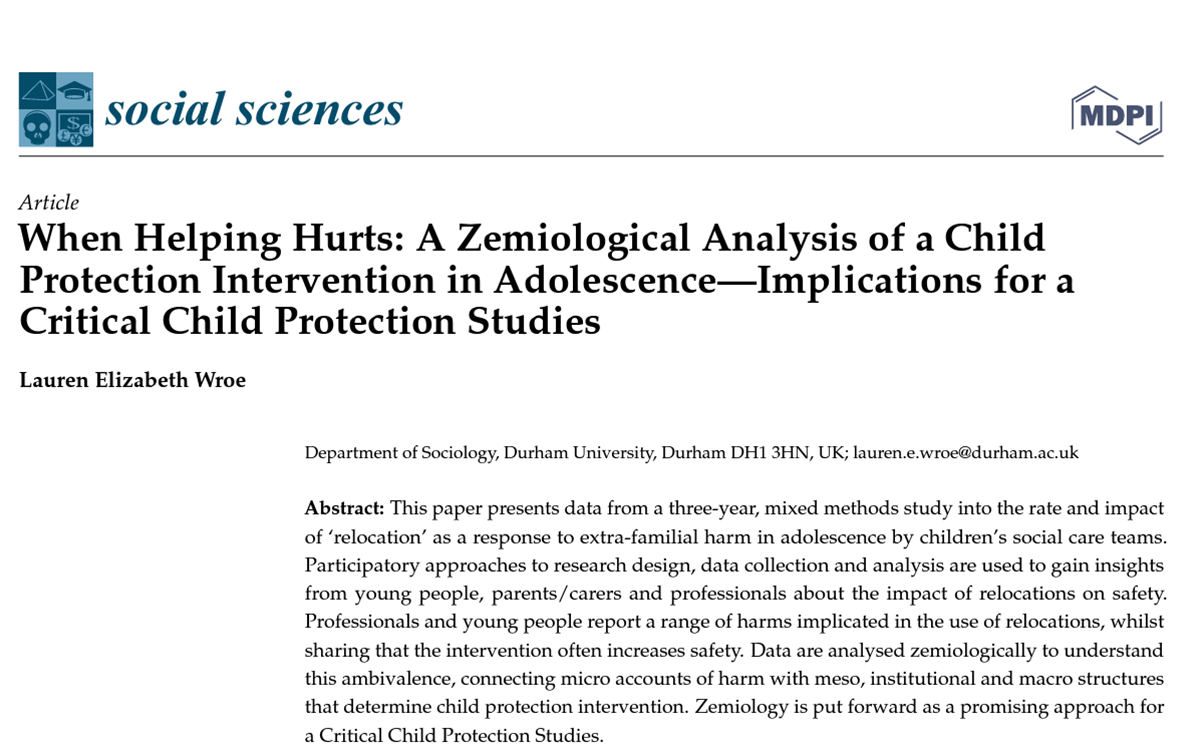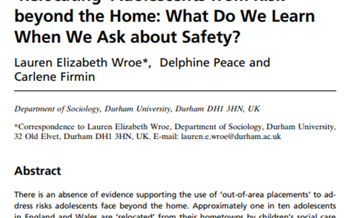 Wroe, Peace & Firmin (2023). There is an absence of evidence supporting the use of ‘out-of-area placements’ to address risks adolescents face beyond the home. Using participatory approaches to research design and data collection, this article asks what do we learn about the impact of relocations when we ask about safety?