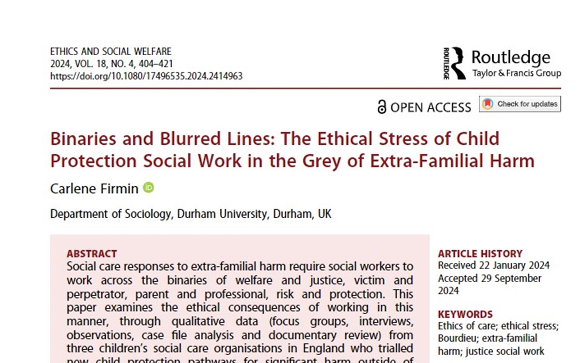 Firmin, C. (2024). This publication explores the ethical consequences of social workers working across binaries such as welfare/justice and victim/perpetrator. The challenges of doing so evidence the importance of foregrounding social work values in the pursuit of welfare-based response to extra-familial harm.