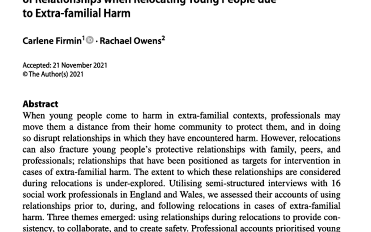 Firmin and Owens (2022). When young people come to harm in extra-familial contexts, professionals may move them a distance from their home community to protect them, and in doing so disrupt relationships in which they have encountered harm. However, relocations can also fracture young people’s protective relationships with family, peers, and professionals; relationships that have been positioned as targets for intervention in cases of extra-familial harm.
