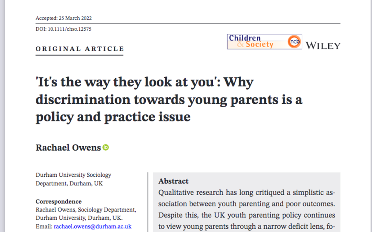 Owens (2022). This paper brings together the direct accounts of young parents' experiences, with ethnographic observation of practice, to argue that discrimination is the critical issue associated with being a young parent.
