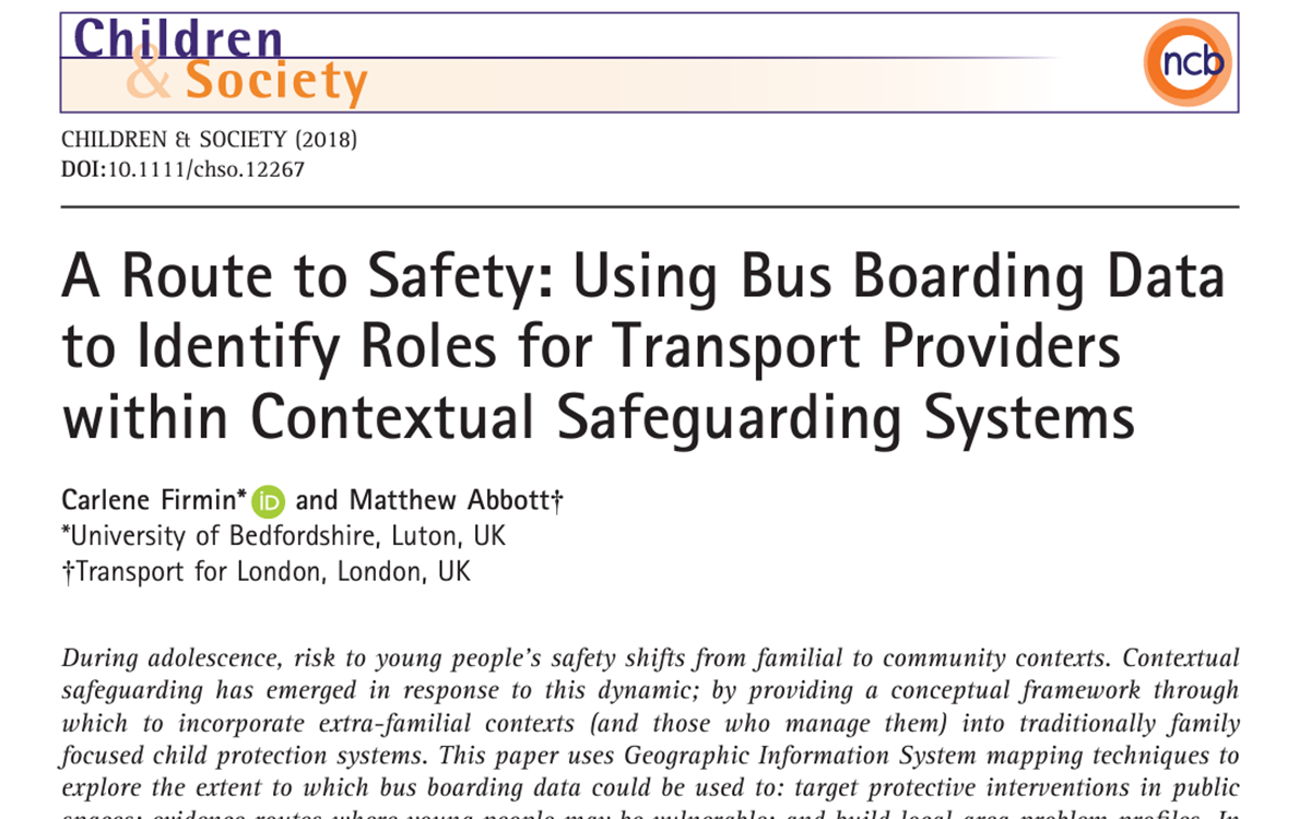 Firmin and Abbott (2018). This paper uses Geographic Information System mapping techniques to explore the extent to which bus boarding data could be used to: target protective interventions in public spaces; evidence routes where young people may be vulnerable; and build local area problem profiles.