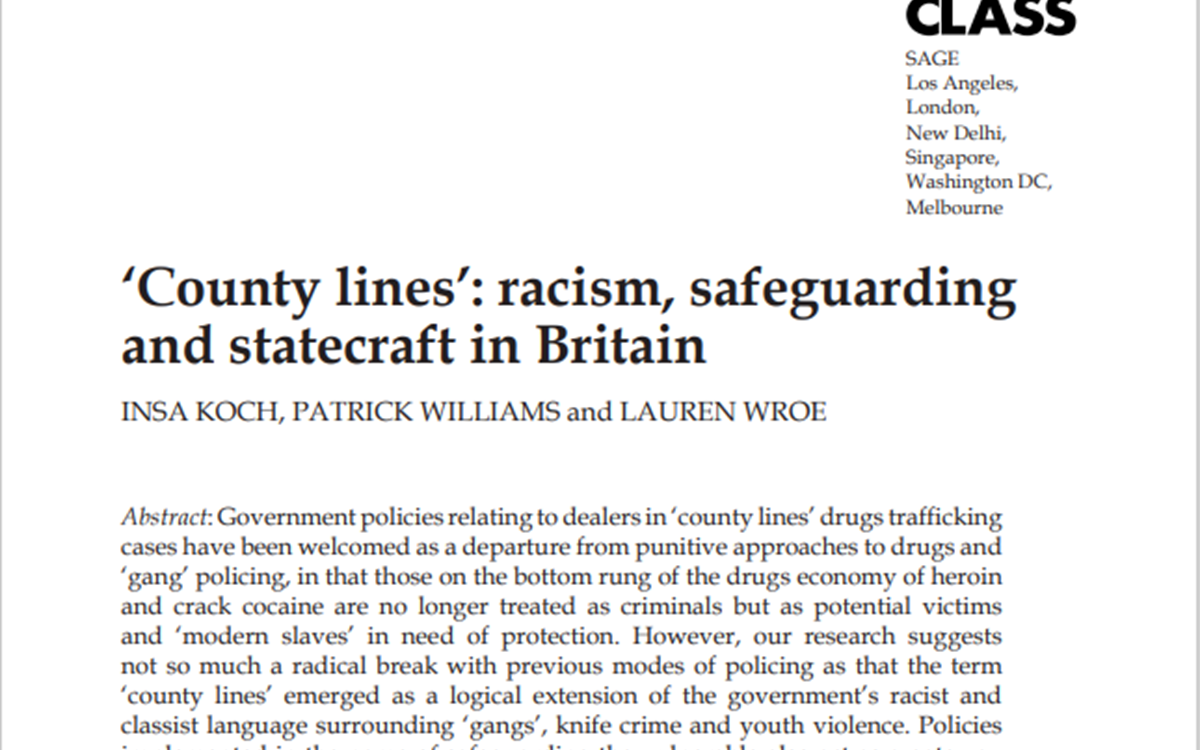 Koch, Williams & Wroe (2023). This paper critically explores how the term ‘county lines’ functions as a logical extension of the government’s racist and classist language surrounding ‘gangs’, knife crime and youth violence, which ultimately leads to the criminalisation of the ‘Black criminal other’ at a time of moral and political crisis.