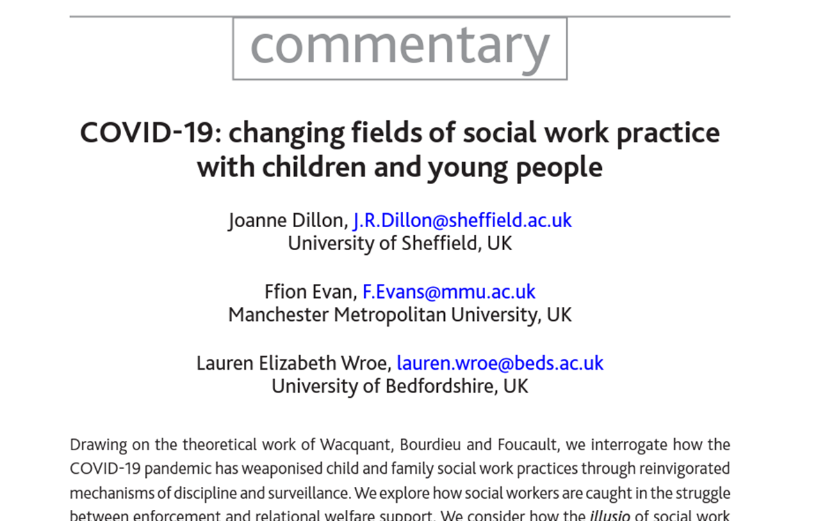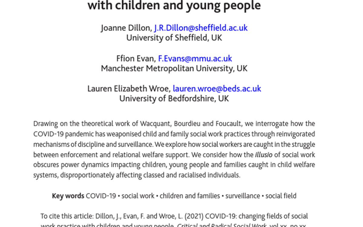 Dillon, Evans & Wroe (2021). Drawing on the theoretical work of Wacquant, Bourdieu and Foucault, we interrogate how the COVID-19 pandemic has weaponised child and family social work practices through reinvigorated mechanisms of discipline and surveillance.