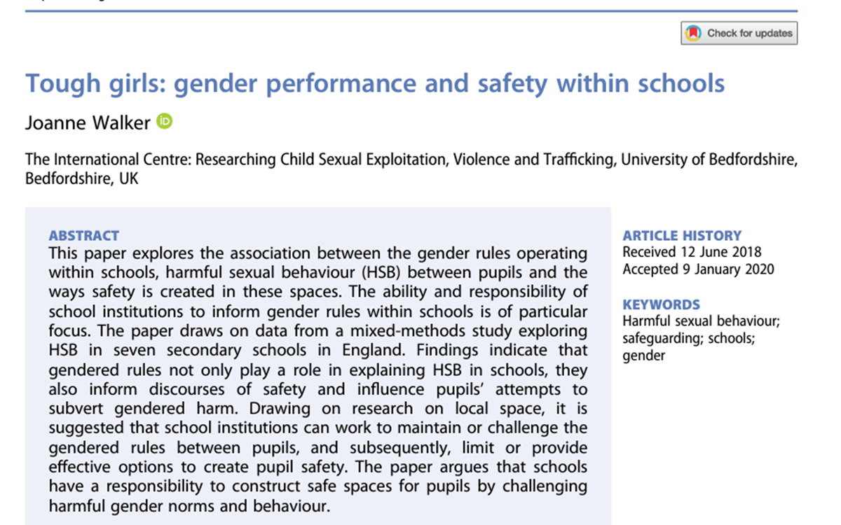 Walker (2020). This paper explores the association between the gender rules operating within schools, harmful sexual behaviour (HSB) between pupils and the ways safety is created in these spaces.