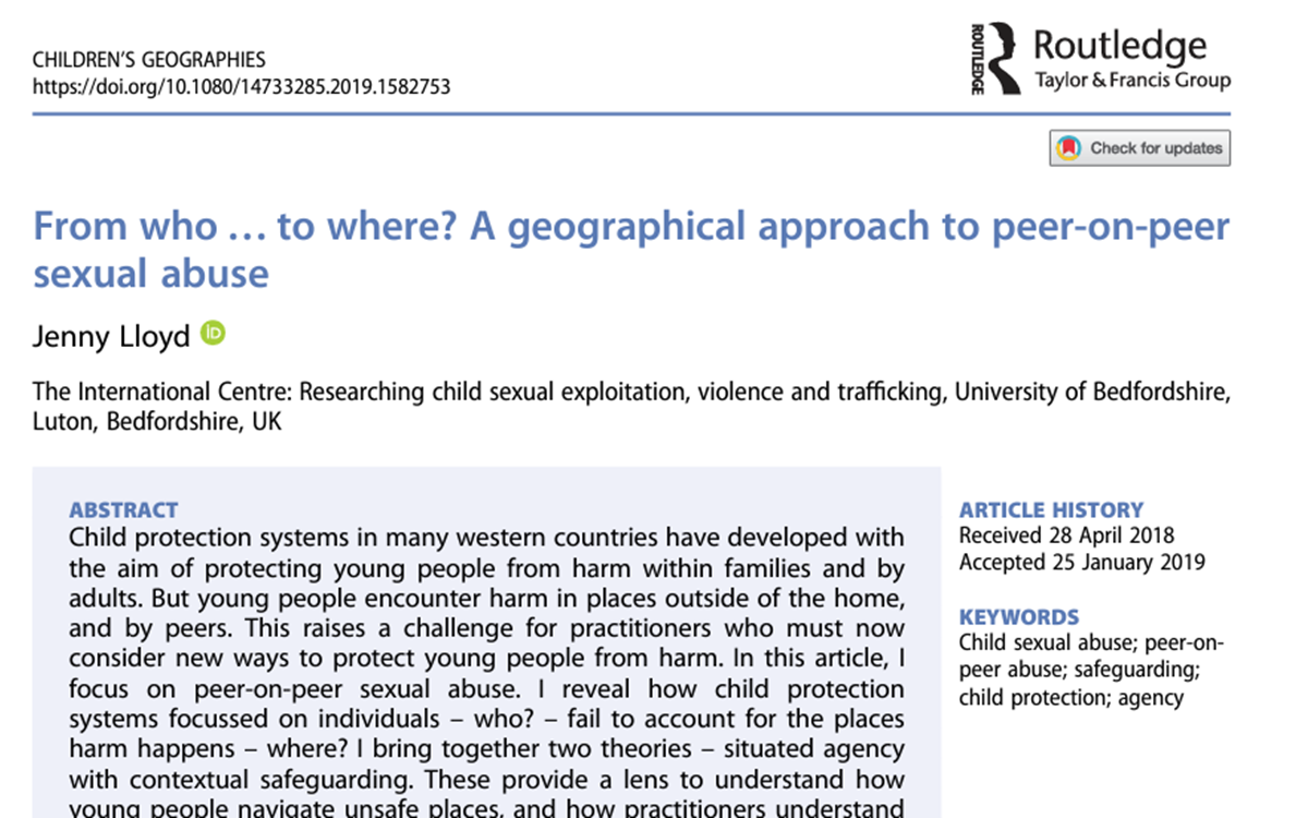 Lloyd (2019). In this article, I focus on peer-on-peer sexual abuse. I reveal how child protection systems focussed on individuals – who? – fail to account for the places harm happens – where?