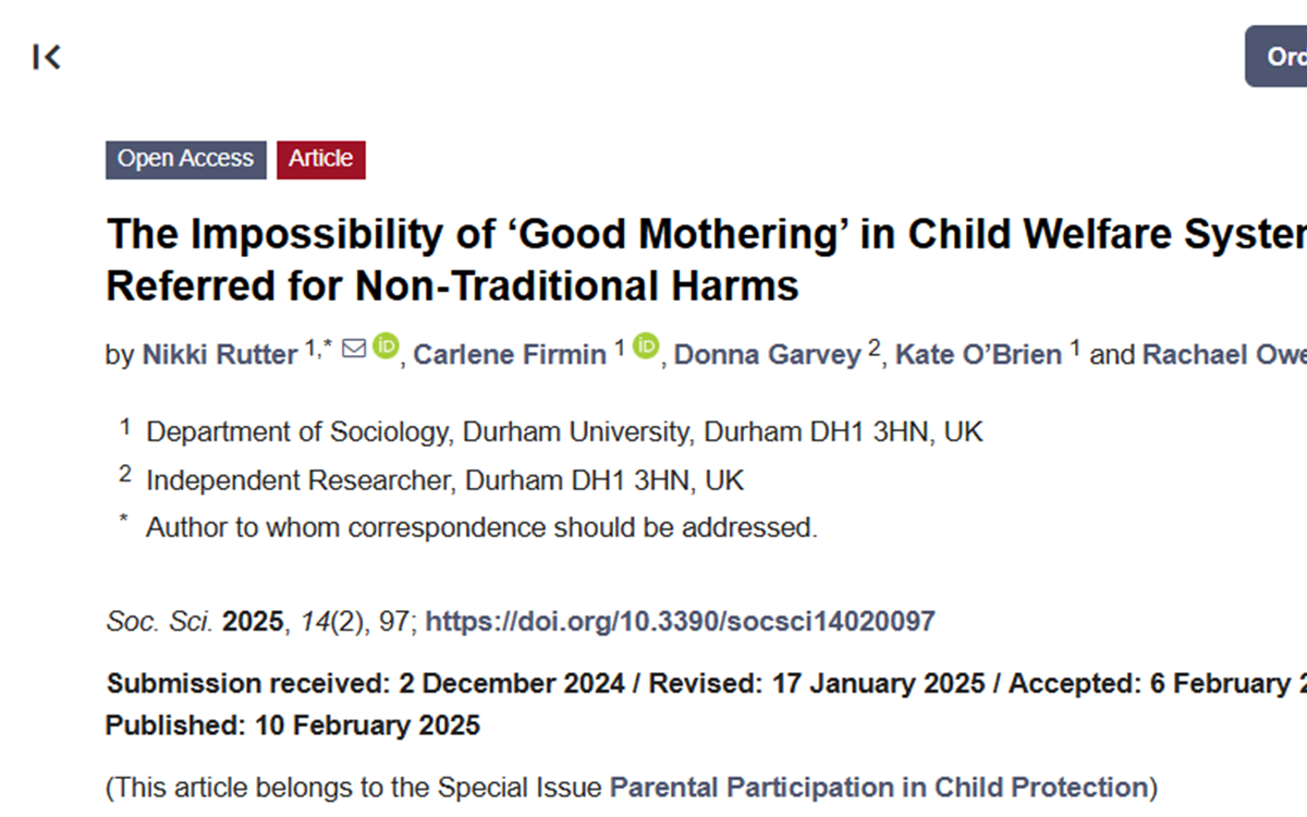 Rutter, N., Firmin, C., Garvey, D., O'Brien, K. and Owens, R. (2025). In this paper the authors argue that participatory and action-based research should be a preferred method of exploring mothers’ experiences of child welfare systems, opening routes for reform.
