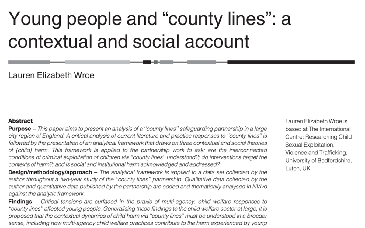 Wroe (2022). This paper aims to present an analysis of a “county lines” safeguarding partnership in a large city region of England.