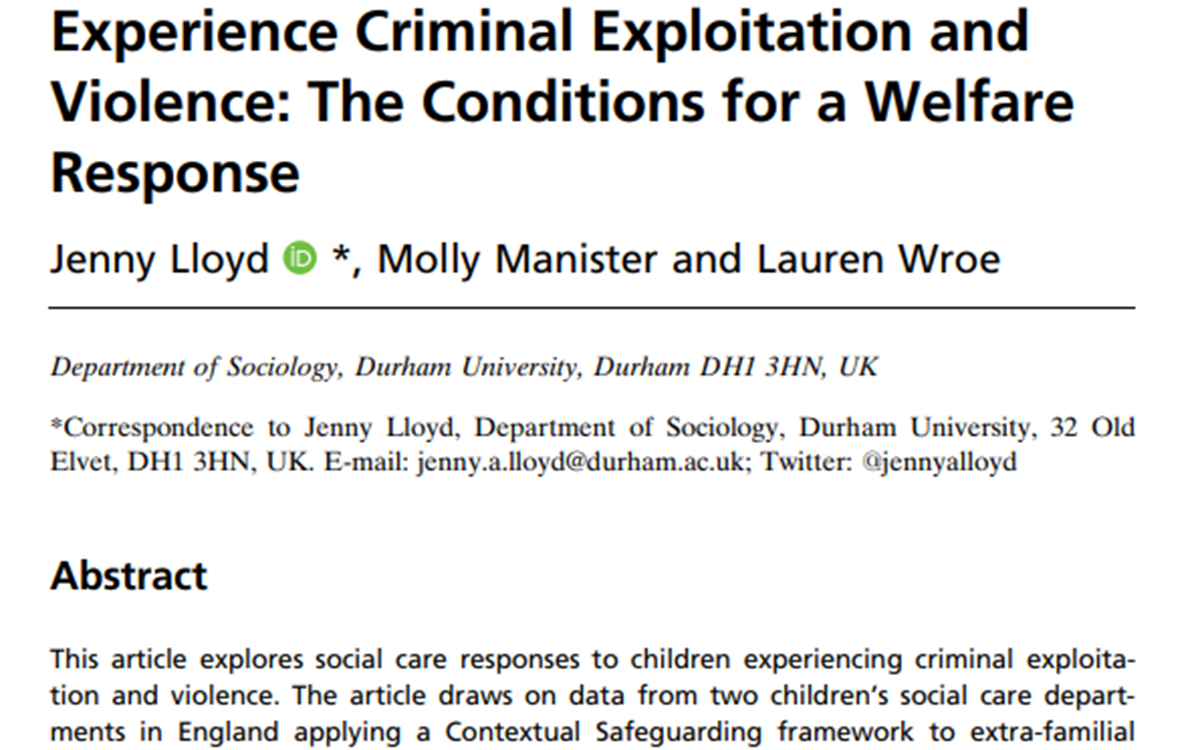 Lloyd, Manister & Wroe (2023). This article explores social care responses to children experiencing criminal exploitation and violence. Follow this link to access the paper and a short webinar.