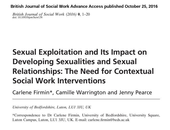 Firmin (2019). Presenting data from two studies into the nature of, and safeguarding response to, peer abuse in England, this article questions the familial parameters of child protection frameworks, and evidences the need to include peer group relationships within social work assessment.