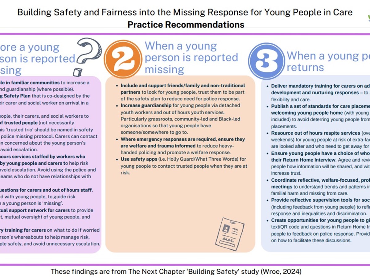 This report shares learning from the Building Safety project about co-designing safety and fairness into the missing response for children in care who are at risk beyond their families. |