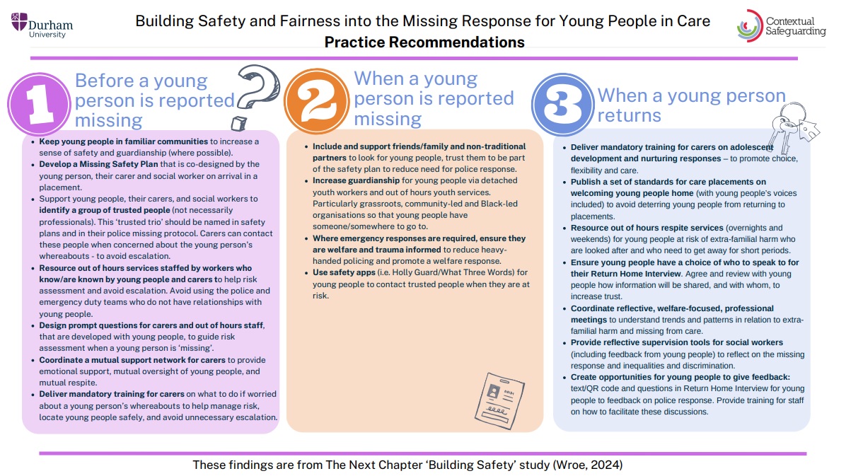 This report shares learning from the Building Safety project about co-designing safety and fairness into the missing response for children in care who are at risk beyond their families. |