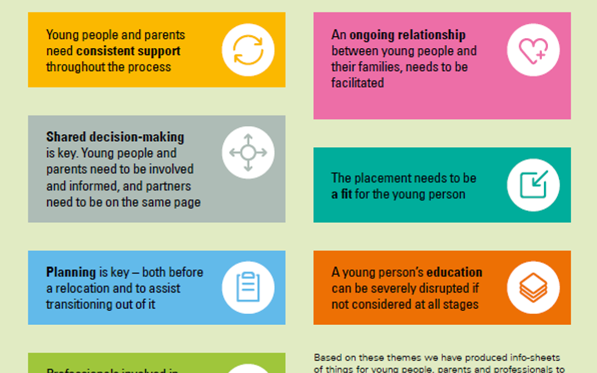 When a young person is at risk of extra-familial harm, they might be moved out of their home area for their safety. As part of the Securing Safety study, we have spoken to young people, parents and professionals with experience of this type of intervention. Based on what they told us, these info-sheets highlight key things for young people, parents and professionals to consider when a move is on the table.