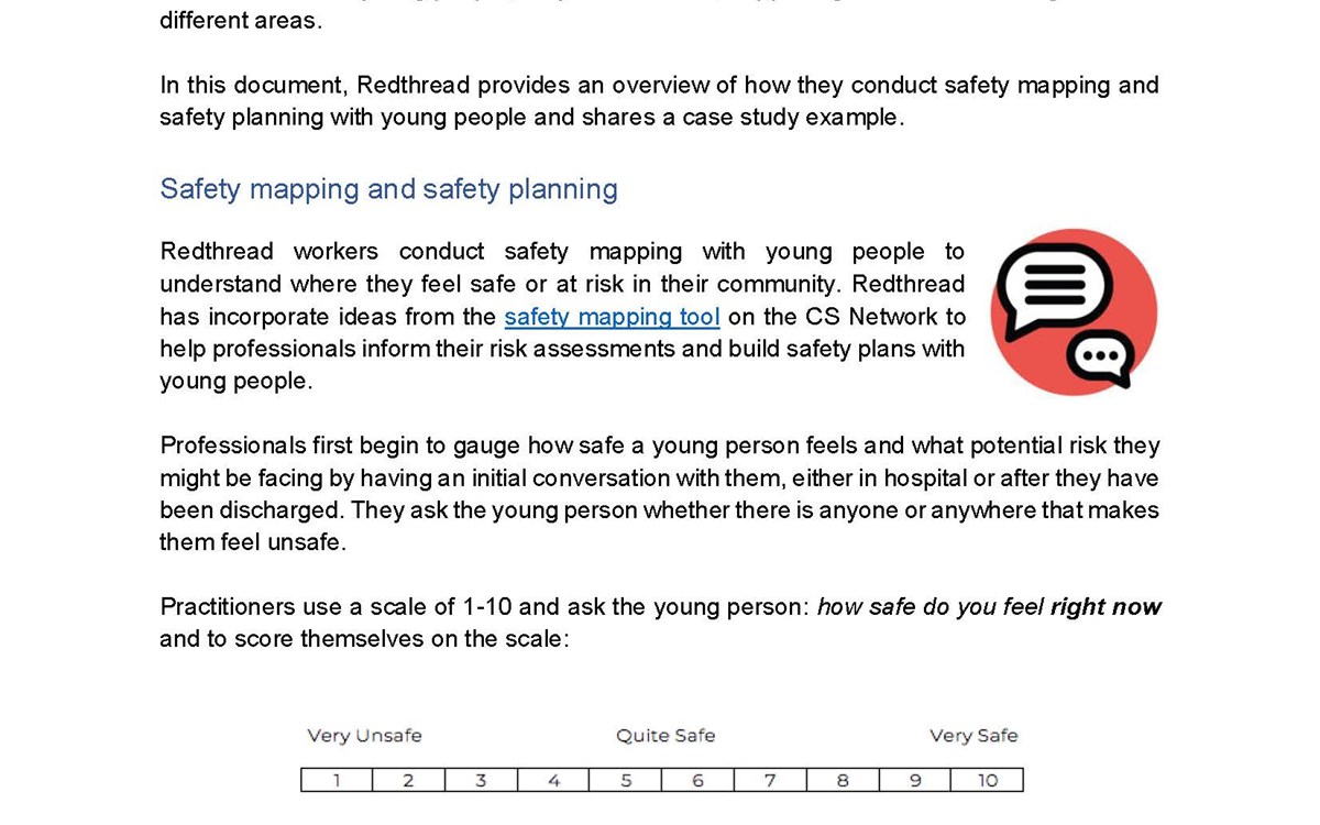 This document provides an overview of how Redthread uses safety mapping and safety planning with young people and shares a case study example.