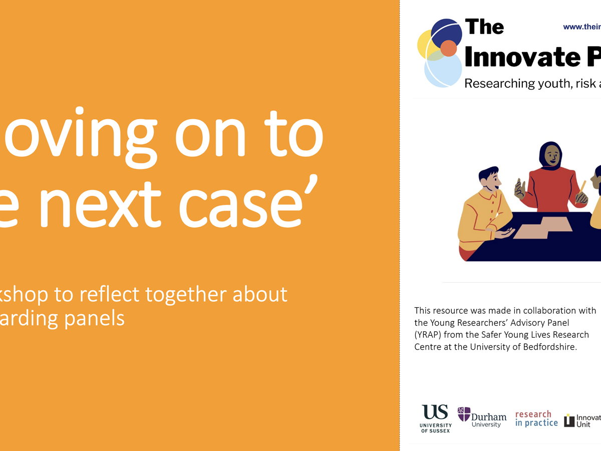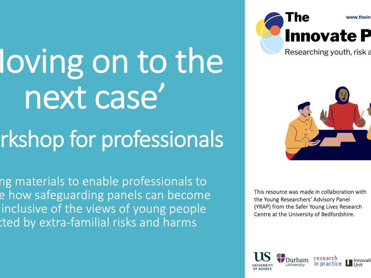 This workshop is designed for panel chairs and other professionals who participate in safeguarding panels for young people affected by extra-familial risks or harm. In this workshop professionals are shown a short video of a fictional safeguarding panel, followed by another video showing young people’s reactions to this fictional panel. They are encouraged to critically reflect on their own panel processes and consider how meetings can become more inclusive of young people’s voices. Ideally this could be an exercise that panels do together. The resources can also be used in other forms of training and group supervision or incorporated into teaching and training curriculums. |