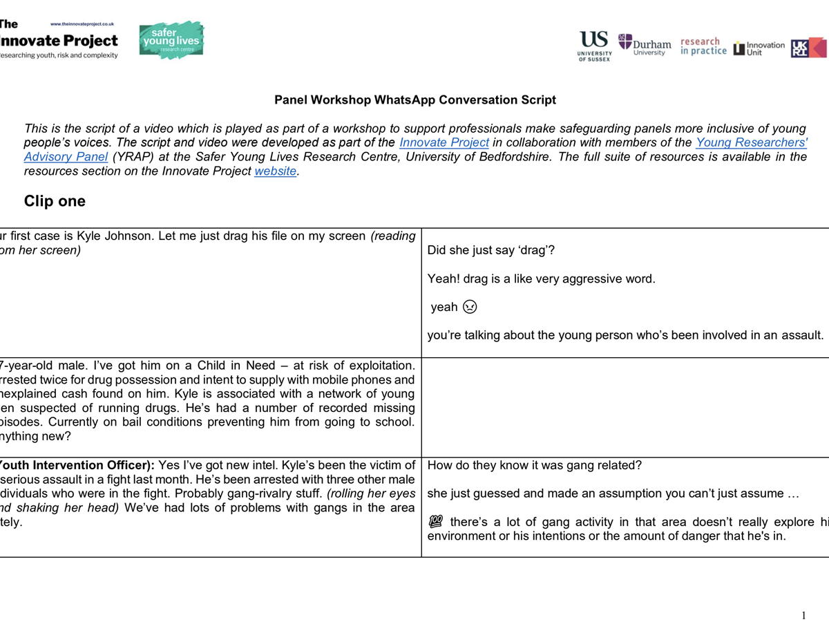 What do young people think about safeguarding panels? How do they feel when they hear how professionals discuss young people in these spaces? Young people rarely participate in these types of meetings. We wanted to show them what these meetings were like, so we created a short fictional meeting video of a safeguarding panel which discusses a young person, ‘Kyle’, who is at risk of extra-familial harm. The script of the video is inspired by the large number of meetings that we have observed as part of the Innovate Project and the Contextual Safeguarding Research Programme more broadly. We then showed this video to young people who are members of the Young Researchers' Advisory Panel (YRAP) at the University of Bedfordshire. We wanted to hear their thoughts about how Kyle was discussed and how the meeting operated. Following this, we created a ‘reaction video’, based exclusively on what young people have said. We also created an ‘improved version’ of the fictional panel video based on comments made by young people about what could be done differently. We have used these videos to design two reflective workshops that you can use, one for professionals and one for young people. See more information about each workshop below by clicking on the dropdown arrows. |