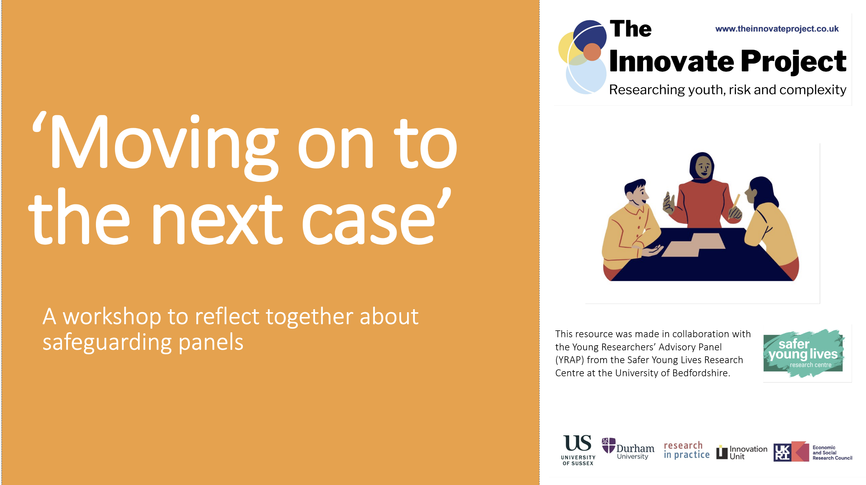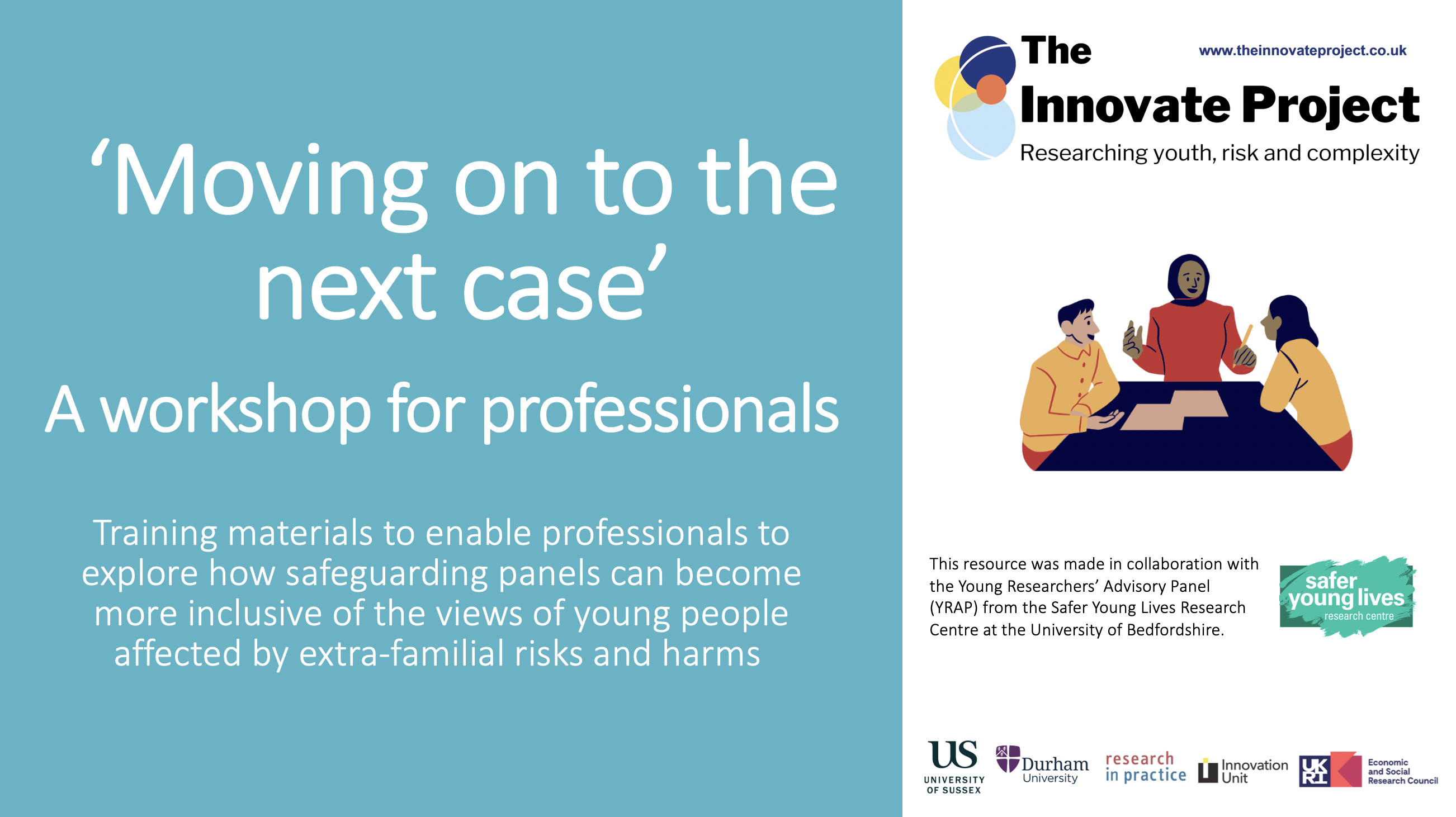 This workshop is designed for panel chairs and other professionals who participate in safeguarding panels for young people affected by extra-familial risks or harm. In this workshop professionals are shown a short video of a fictional safeguarding panel, followed by another video showing young people’s reactions to this fictional panel. They are encouraged to critically reflect on their own panel processes and consider how meetings can become more inclusive of young people’s voices. Ideally this could be an exercise that panels do together. The resources can also be used in other forms of training and group supervision or incorporated into teaching and training curriculums. |