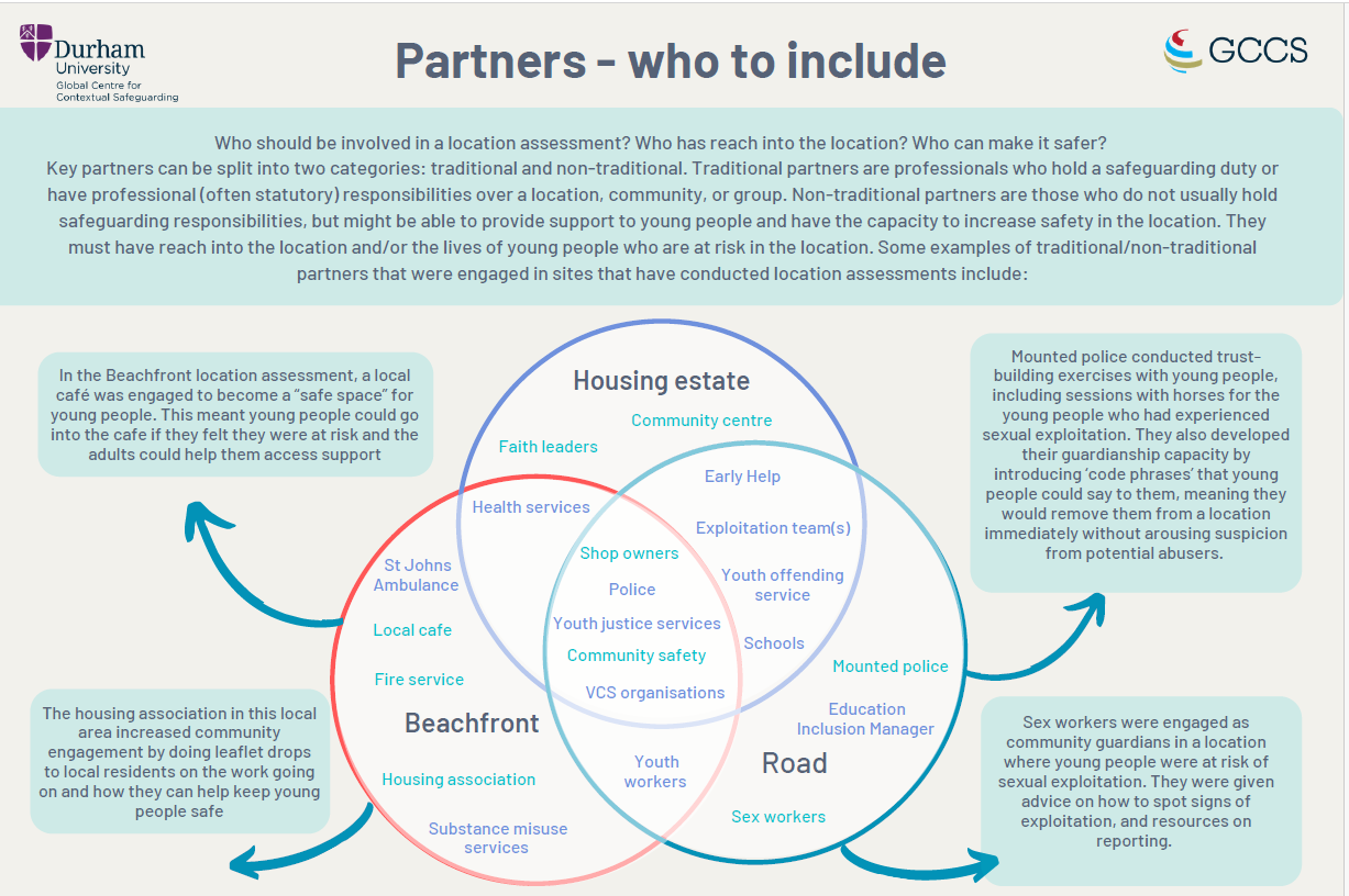 To know who to include start by asking: who has influence in the neighbourhood and who can make it safer? Young people are key partners and their views and experiences will be central to the assessment because it will be shaped by where they feel safe and unsafe, how they experience harm in this location, and what change they would like to see in their community. Below, click on the 'Partners: who to include' infographic in Related Resources to see examples of how traditional and non-traditional partners can be engaged in neighbourhood assessments.