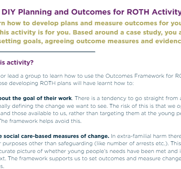 If you are involved in planning safeguarding responses for young people on ROTH pathways and want to know if you’re making a difference, then these tools are for you. They’ll be especially useful for ROTH Chairs but will also be good for anyone attending a ROTH conference who wants to understand the key principles and approaches behind planning responses and measuring outcomes for ROTH.