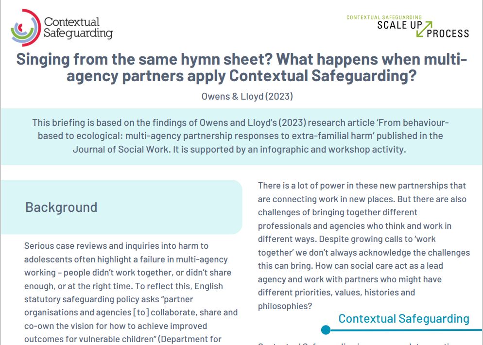 These resources are designed to help partnerships to understand the challenges involved in doing Contextual Safeguarding work within a multi-agency setting. They encourage professionals to reflect and develop new ways of working. From a 1-page infographic to a 1-hour workshop, there is a range of things that you can select to support you on this journey.
