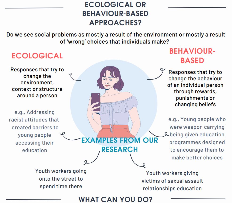 As the resources explain, approaches which focus on the behaviour of young people tend to dominate the helping professions. It’s not surprising that they would be seen in the discussions, plans and responses of multi-agency safeguarding work. To understand this better, we have given examples of what behaviour-based work looks like and how they contradict a Contextual Safeguarding approach. We also give examples of what it means to work in an ecological way, that focusses on changing the context.